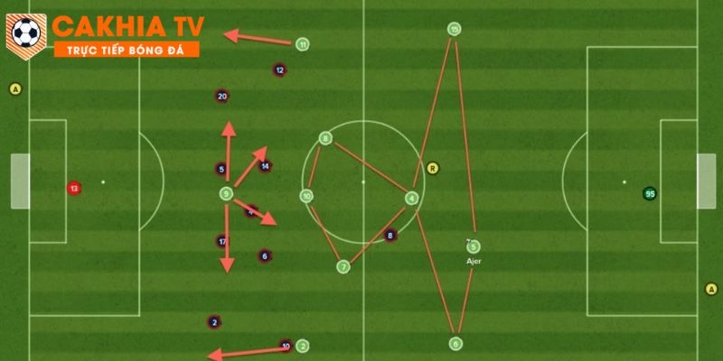 - Di chuyển thông minh: Các tam giác chuyền 3 người được hình thành khắp mặt sân. Mỗi cầu thủ luôn tạo khoảng trống cho người cầm bóng.