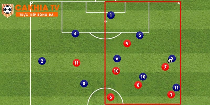 - Hàng công gồm ba cầu thủ di chuyển không bóng linh hoạt, ép hậu vệ đối phương.